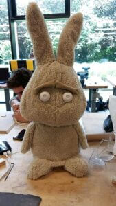 A unique personality was crafted for Lou, designed to assist with emotional expression. A rabbit character was chosen for its inviting nature, named Lou to maintain a unisex appeal, and dressed in a “tough” style to avoid a childish appearance.
